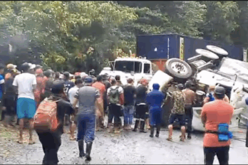 Vehículo de carga pesada quedó volcado en la vía y un grupo significativo de personas se ha congregado en el lugar del siniestro.