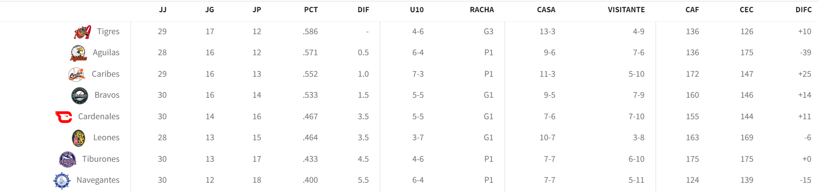 En la tabla, el primer lugar y el último, aún no se supera los seis encuentros. Y los Tigres de Aragua, luego de salir de su mala racha, vuelven a la cima de la clasificación, aunque por una leve ventaja.
