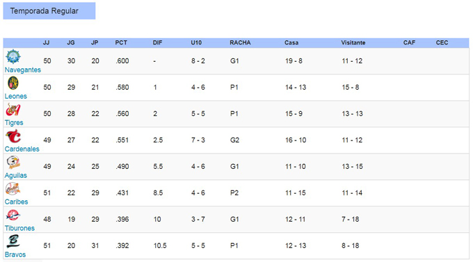Conoce cómo va la tabla de posiciones de la Lvbp