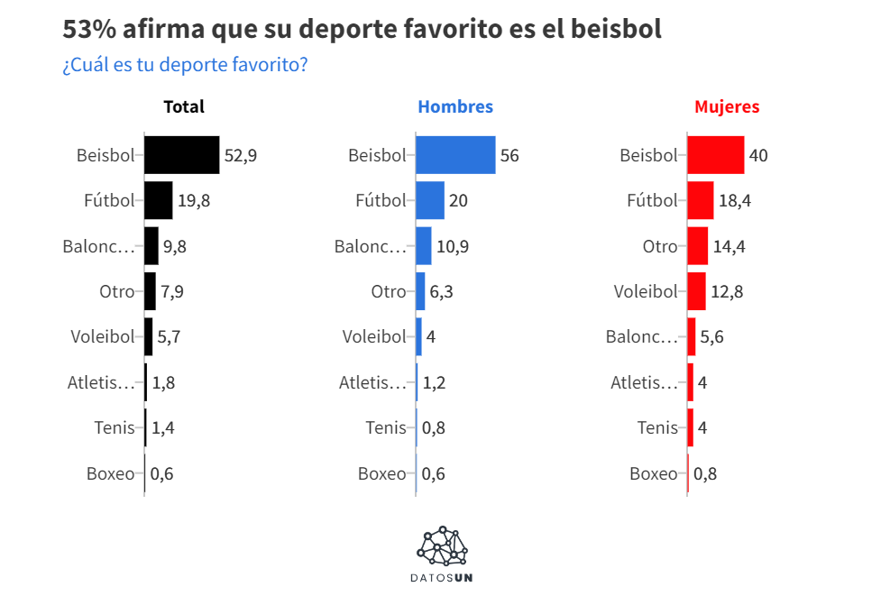 El primer hallazgo es que al preguntarle a los participantes por su deporte favorito obtuvimos que 52,9% respondió que es el beisbol. Este porcentaje sube a 56% cuando observamos solo a los hombres y baja a 40% en las mujeres.