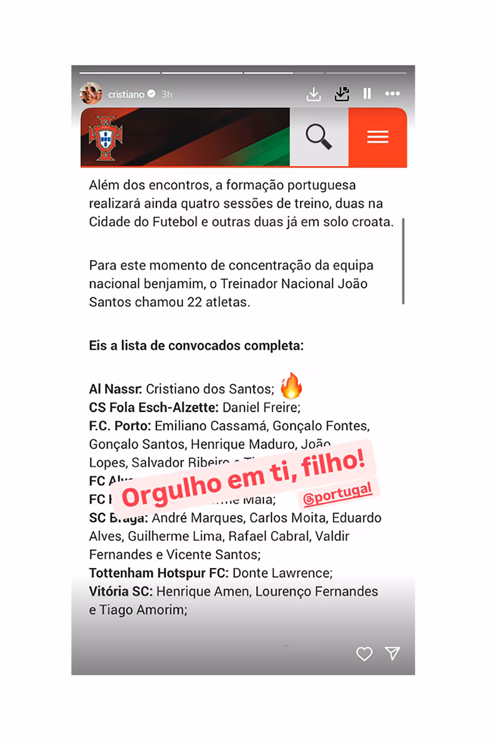 Cristiano Ronaldo, máximo goleador en la historia del fútbol con 934 goles acumulados a lo largo de su trayectoria, celebró la convocatoria de su hijo con un emotivo mensaje en sus redes sociales. “Orgulloso de ti, hijo”, comentó el delantero en sus plataformas junto con una captura del comunicado oficial, evidenciando su alegría por el debut internacional de Cristiano Jr.
