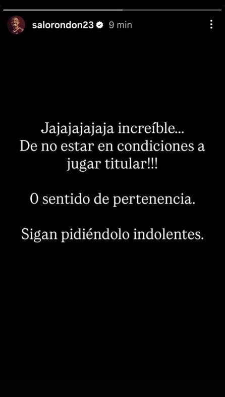 A través de su cuenta personal de Instagram, Salomón escribió: “Jajajajajaja increíble… De no estar en condiciones de jugar titular!!! 0 sentido de pertenencia. Sigan pidiéndolo indolentes”.
