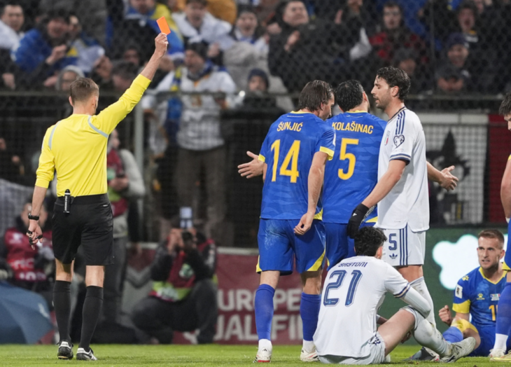 El central zurdo, uno de los objetivos del Barcelona para el siguiente mercado de verano, vio la roja directa -justo cuando su selección ganaba por 0-1- por ser último hombre en jugada de ataque directo contra Bosnia, que se terminó quedando con el boleto al imponerse por penales 4-1 (1-1).