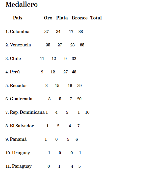 Le siguió Venezuela con dos preseas doradas menos (35), así como 27 platas y 23 bronces, para un total de 85 metales.