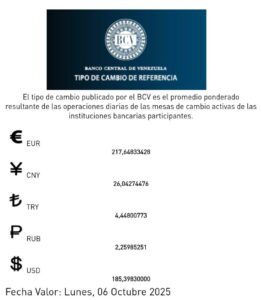 El precio del dólar publicado por el Banco Central de Venezuela (BCV), que estará vigente para este lunes 6 de octubre será de 185,39 bolívares por unidad.