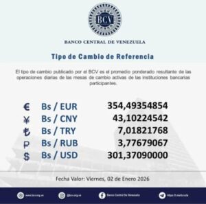 El Banco Central de Venezuela (BCV) actualizó las tasas cambiarias que estarán vigentes para el viernes 2 de enero.