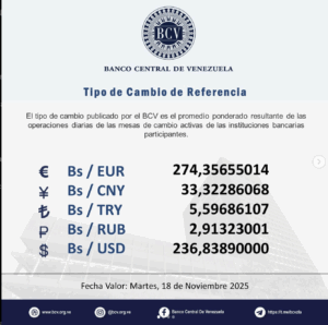 El BCV recuerda que estos valores representan el tipo de cambio oficial vigente en el país, para este martes 18 de noviembre.