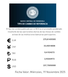 El Banco Central de Venezuela (BCV) estableció el valor de la divisa para este miércoles 19 de noviembre.