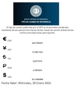 El Banco Central de Venezuela (BCV) oficializa el valor de las tasas cambiarias, para este miércoles 28 de enero.