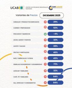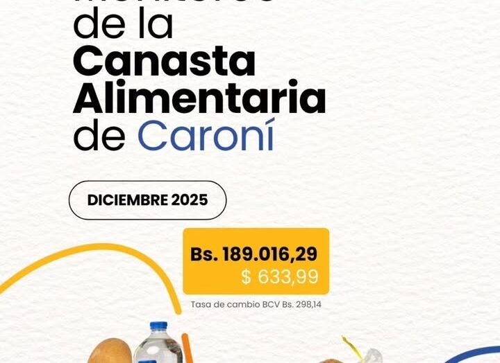 El Centro de Estudios Regionales de la Universidad Católica Andrés Bello, seccional Guayana, en alianza con la Cámara de Comercio en Caroní, emitió el balance sobre el costo de la Canasta Básica Alimentaria correspondiente al mes de diciembre de 2025, que alcanzó un costo de Bs. 189.016,29, lo que representa aproximadamente $633,99 a la tasa oficial.