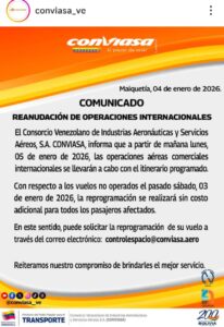 A través de un comunicado publicado en su cuenta de Instagram, Conviasa explicó que los vuelos que no se realizaron el sábado 03 de enero, serán reprogramados sin costo adicional para todos los pasajeros afectados.