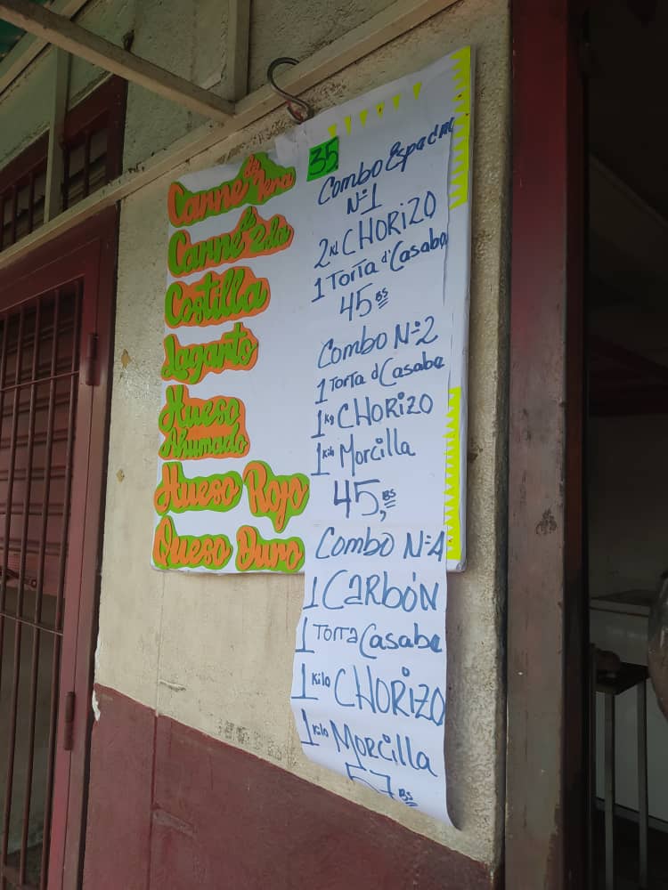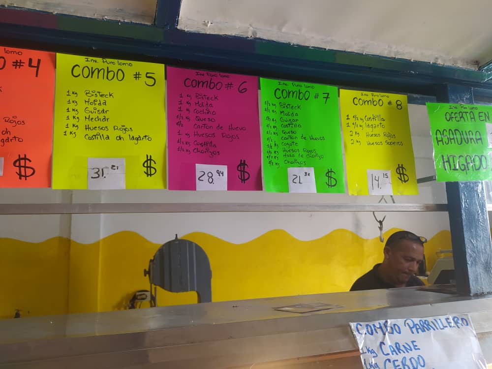El precio del kilo de carne de primera oscila entre 30 y 35 bolívares. La jugada de los comerciantes es armar combos para fomentar las ventas. Por ejemplo, kilo y medio de costilla, kilo y medio de lagarto, dos kilos de huesos rojos y dos kilos de huesos soperos por 14 dólares aproximadamente. Otros combos, entre una torta de casabe, un kilo de chorizo y un kilo de morcilla por 57 bolívares.