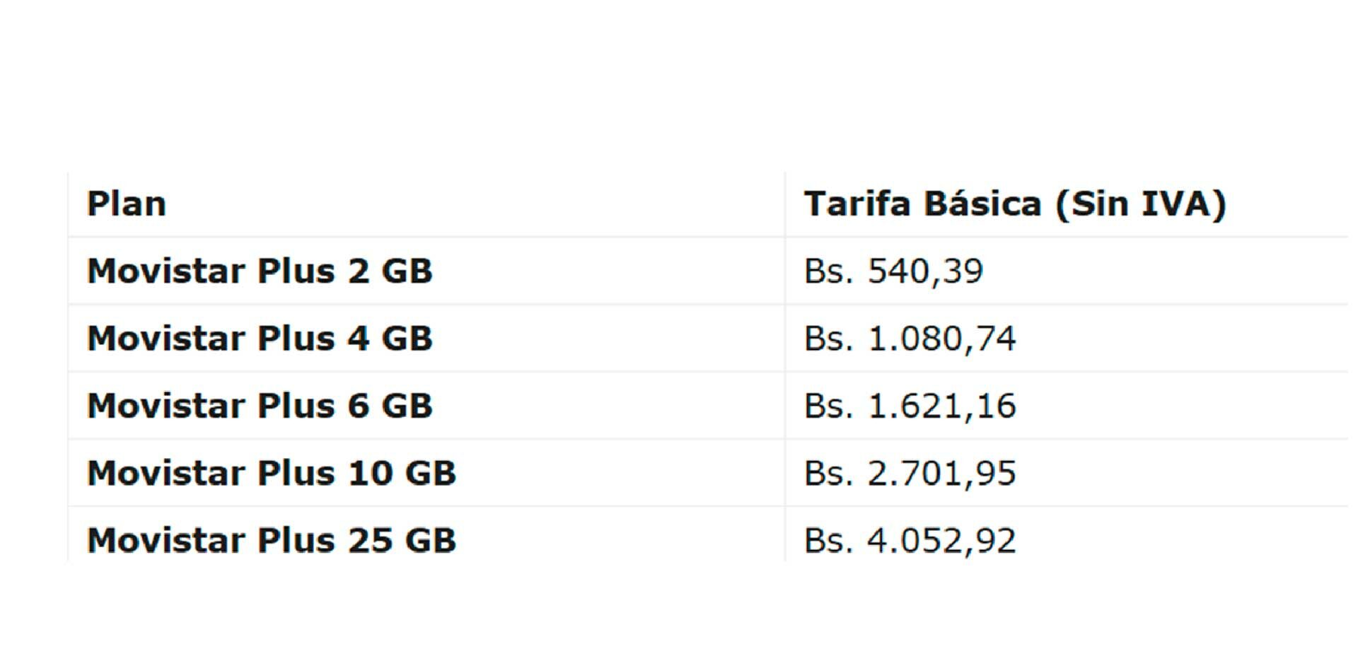 Los planes Movistar Plus, que integran minutos de voz, mensajes de texto (SMS) y cupos de navegación, presentan los siguientes precios base (importante destacar que estos montos no incluyen el Impuesto al Valor Agregado o IVA):