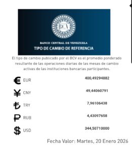 El Banco Central de Venezuela (BCV) actualizó las tasas cambiarias para este martes 20 de enero.