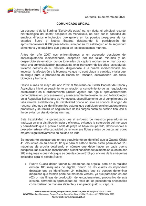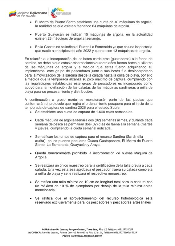 El Ministerio del Poder Popular de Pesca y Acuicultura anunció el nuevo protocolo de ordenamiento pesquero para la temporada de sardinas 2026.
