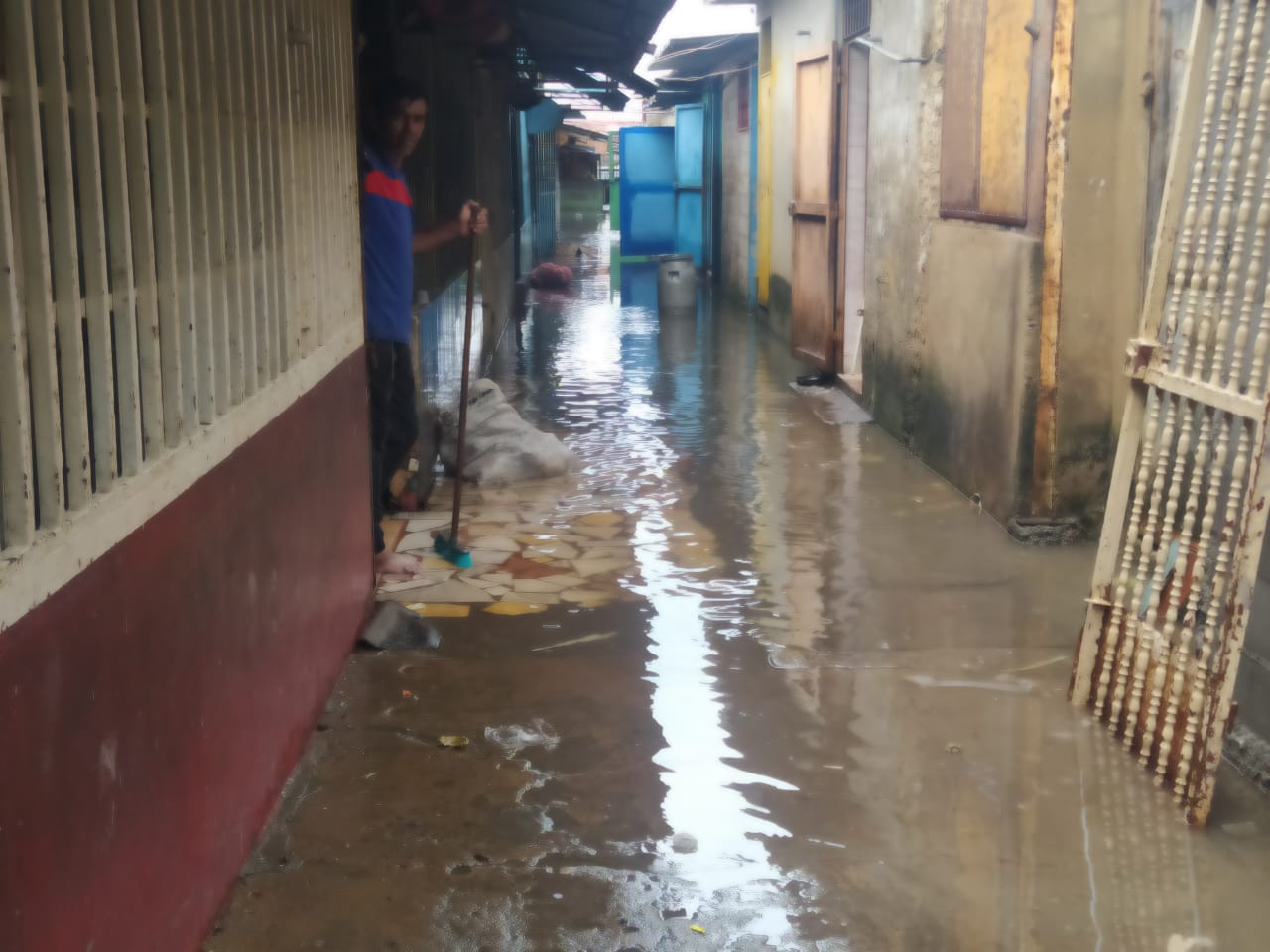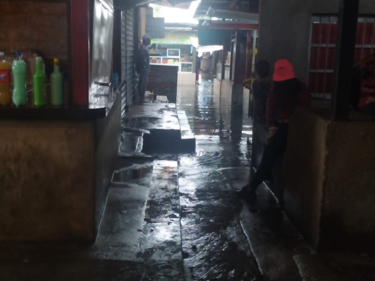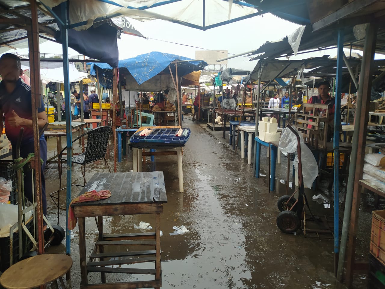 En medio de un fuerte aguacero PRIMICIA constató las deficiencias del mercado en un pequeño recorrido por las instalaciones el pasado 21 de septiembre: el colapso de las alcantarillas anegó pasillos en el área del pollo y pequeños restaurantes, aunque los techos de los negocios no presentaban filtraciones, pues por cuenta propia tratan de mantener los locales.