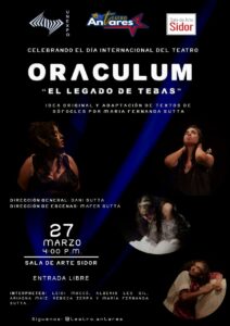 El 27 la cita será en la Sala de Arte Sidor, ubicada en Alta Vista para presentar la obra Oraculum, basada en textos de Sofocles. Señala que cerrarán la semana en la Casa de la Cultura Héctor Guillermo Villalobos, a las 4:00 p.m. en el encuentro teatral organizado por Fariña.