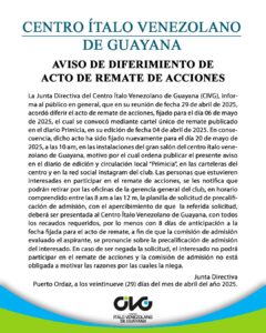 La Junta Directiva del Centro Ítalo Venezolano de Guayana (CIVG), informa al público en general, que en su reunión de fecha 29 de abril de 2025, acordó diferir el acto de remate de acciones, fijado para el día 06 de mayo de 2025, el cual se convocó mediante cartel único de remate publicado en el diario Primicia, en su edición de fecha 04 de abril de 2025.