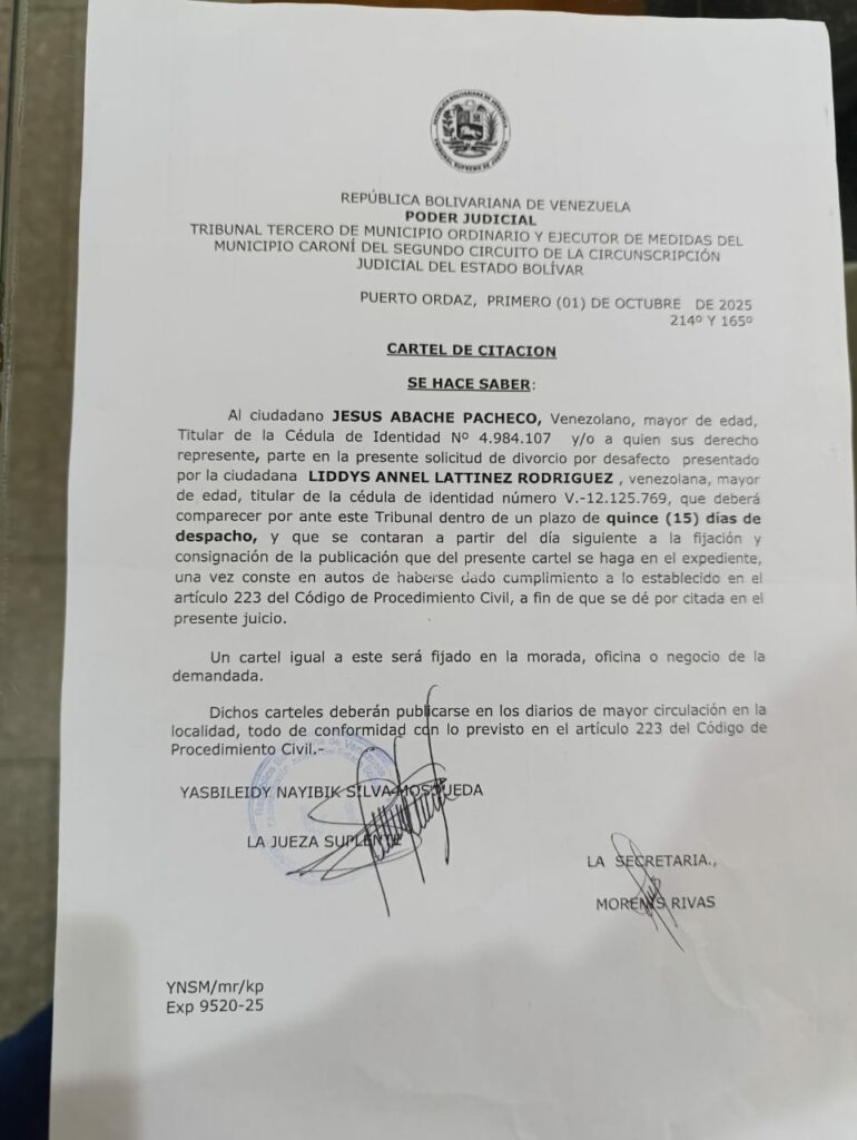 Al ciudadano JESUS ABACHE PACHECO, Venezolano, mayor de edad, Titular de la Cédula de Identidad Nº 4.984.107 y/o a quien sus derecho represente, parte en la presente solicitud de divorcio por desafecto presentado por la ciudadana LIDDYS ANNEL LATTINEZ RODRIGUEZ, venezolana, mayor de edad, titular de la cédula de identidad número V.-12.125.769, que deberá comparecer por ante este Tribunal dentro de un plazo de quince (15) días de despacho, y que se contarán a partir del día siguiente a la fijación y consignación de la publicación que del presente cartel se haga en el expediente, una vez conste en autos de haberse dado cumplimiento a lo establecido en el artículo 223 del Código de Procedimiento Civil, a fin de que se dé por citada en el presente juicio.