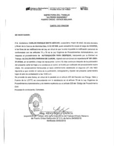 Al ciudadano: CARLOS ENRIQUE BRITO AZÓCAR, venezolano, mayor de edad, de este domicilio y titular de la Cédula de Identidad Nro. V-12.127.565, quien actualmente ocupa el cargo de CHOFER, a los fines de las notificaciones de Ley, en virtud de que ha sido imposible la notificación personal de conformidad con los artículos 75 y 76 de la Ley Orgánica de Procedimientos Administrativos, con respecto al procedimiento de AUTORIZACIÓN PARA DESPEDIR, interpuesto por la Entidad de Trabajo: ALCALDÍA BOLIVARIANA DE CARONÍ, signado con el número de expediente N° 051-2024-01-01644, en tal sentido y luego de transcurrido quince (15) días continuos después de la publicación del presente cartel se haga y su constancia en autos, se tendrá por notificado del procedimiento supra citado. En consecuencia transcurrido el lapso anteriormente establecido al segundo (2do) día hábil siguiente a que conste en autos de la publicación, consignación y fijación del presente cartel tendrá lugar el acto de contestación a las 10:00 a.m.