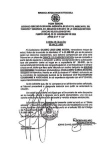 Al ciudadano: GILBERTO JOSÉ LÓPEZ MEDINA, venezolano mayor de edad, titular de la cédula de identidad N° V-11.338.989, y/o en la persona quien sus derechos representen, que deberá comparecer por ante este Tribunal en un plazo de QUINCE (15) DÍAS DE DESPACHO y que se contarán a partir del día siguiente a la fijación y última consignación de la publicación que del presente cartel se haga en el expediente N° 25-0101, de la nomenclatura interna de este despacho judicial, a los fines de que se dé por citado en el Juicio que lleva este Tribunal con motivo del juicio de NULIDAD DE CONTRATO, incoado por el ciudadano: JESÚS ALBERTO GARCÍA SÁNCHEZ, abogado en ejercicio, inscrito en el L.P.S.A bajo el Nº 148.669, actuando en su condición de apoderado judicial de la Sociedad Civil VILLAVICENCIO COLMENAREZ & ASOCIADOS, en el expediente signado con el N° 25-0101, supra mencionada en autos.