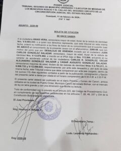 A la ciudadana ANAIS VERA, venezolana mayor de edad, titular de la cédula de identidad Nro. V-9.903.333, o a quien sus derechos represente, que este tribunal en esta misma fecha, ordenó su notificación a los fines de hacer de su conocimiento que el suscrito Juez SE ABOCÓ al conocimiento de la presente causa con el alfanumérico, 2280-08, que con motivo del juicio que por: DESALOJO DE VIVIENDA incoado por el ciudadano JUAN CARLOS GONZÁLEZ SALAZAR, venezolano, mayor de edad, titular de la cédula de identidad Nro. V-12.876.464, e inscrito en el IPSA bajo el Nro. 113.994, actuando en su carácter de apoderado judicial de los ciudadanos CARLOS R. GONZÁLEZ, OSCAR ALEJANDRO GONZÁLEZ SALAZAR Y CASAR AUGUSTO GONZÁLEZ SALAZAR, venezolanos mayores de edad, titulare de las cédulas de identidad Nros V-2.793.211, V-9.906.733 y V-12.559.633, respectivamente; por ante este despacho y por auto de esta misma fecha, este Tribunal ordena que debe comparecer por ante ese Juzgado, dentro de los quince (15) días siguientes contados a partir de la publicación, consignación y fijación del presente cartel a darse por citada en el horario comprendido de 8:30 A.M. a 3:30 Ρ.Μ.