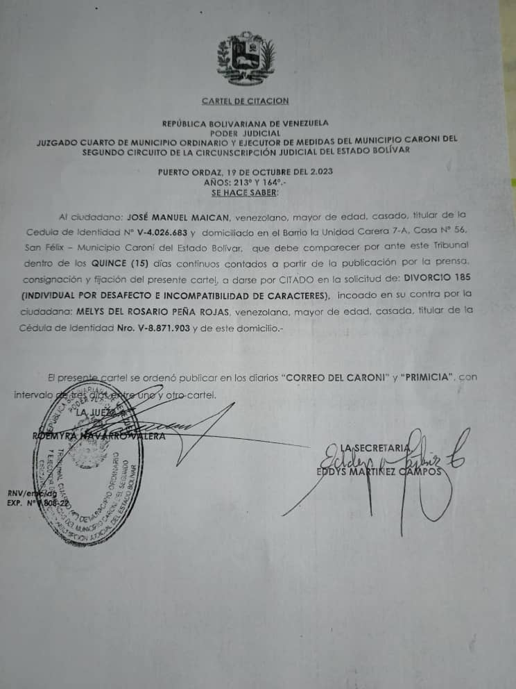 Al ciudadano: JOSÉ MANUEL MAICAN, venezolano, mayor de edad, casado, titular de la Cédula de Identidad N° V-4.026.683 y domiciliado en el Barrio la Unidad Carera 7-A, Casa N° 56, San Félix – Municipio Caroní del Estado Bolívar, que debe comparecer por ante este Tribunal dentro de los QUINCE (15) días continuos contados a partir de la publicación por la prensa, consignación y fijación del presente cartel, a darse por CITADO en la solicitud de: DIVORCIO 185 (INDIVIDUAL POR DESAFECTO E INCOMPATIBILIDAD DE CARACTERES), incoado en su contra por la ciudadana: MELYS DEL ROSARIO PEÑA ROJAS, venezolana, mayor de edad, casada, titular de la Cédula de Identidad Nro. V-8.871.903 y de este domicilio.-