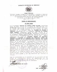 A la ciudadana: MARISOL DEL ROSARIO GOMEZ SALAZAR, Venezolana, mayor de edad, titular de la cédula de identidad Nro. V.-10.553.460, domiciliada en la Urbanización Yuruari, Municipio El Callao del Estado Bolívar en su carácter de parte demandada en la presente Causa de NULIDAD DE CESION Y TRASPASO, presentado por la ciudadana: FELICITA DE LOURDES GOMEZ SALAZAR, venezolana, mayor de edad, titular de la cédula de identidad Nro.V-4.778.587, debidamente asistida por el ciudadano: CARMELO CANELON MENDOZA, abogado en ejercicio e inscrito en el impreabogado bajo el N° 316.463, que deberá comparecer por ante el TRIBUNAL SEGUNDO DE MUNICIPIO ORDINARIO Y EJECUTOR DE MEDIDAS DEL MUNICIPIO CARONI DEL SEGUNDO CIRCUITO DE LA CIRCUNSCRIPCION JUDICIAL DEL ESTADO BOLIVAR, dentro de los quince (15) días siguientes contados a partir de la publicación consignación y fijación que del presente cartel se haga, a darse por citada a los fines de dar su contestación a las pretensiones establecidas por la demandante, en el horario comprendido de 8:30 Α.Μ. A 3:30 Ρ.Μ. Se le advierte que, si no comparece en el lapso antes señalado, se le designará Defensor Judicial con quién se entenderá la citación y demás diligencias del presente proceso hasta su terminación. El presente cartel deberá ser publicado en el diario Primicia y Correo del Caroní, ambos editados en la ciudad de Puerto Ordaz, Municipio Caroní del estado Bolívar, con el intervalo de tres días entre uno y el otro en letra grande y con una dimensión que facilite su lectura.