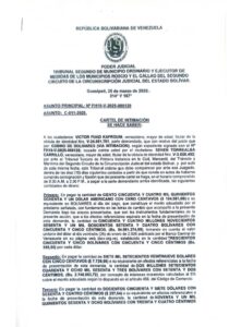 A los ciudadanos: VICTOR FUAD KAFROUNI, venezolano, mayor de edad, titular de la cédula de identidad Nro. V-24.891.701, parte demandada, que con motivo del juicio que por: COBRO DE BOLIVARES (VIA INTIMACION), según expediente signado con el N° FH19-V-2025-000128; incoado contra usted por el ciudadano: SENEN TORREALBA CARRILLO, venezolano, mayor de edad, titular de la cédula de identidad Nro. V-3.020.482; por ante el Tribunal Tercero de Primera Instancia en lo Civil, Mercantil, del Tránsito y Marítimo del Segundo Circuito de la Circunscripción Judicial del estado Bolívar, y por auto de esta misma fecha, este Tribunal ordena que debe comparecer por ante ese Juzgado, dentro de los diez (10) días siguientes contados a partir de que conste en autos de haberse cumplido consignación y fijación que del presente cartel se haga, en el horario comprendido de 8:30 A.M. a 3:30 P.M., a pagar a la parte demandante arriba identificada, las siguientes cantidades de dinero: