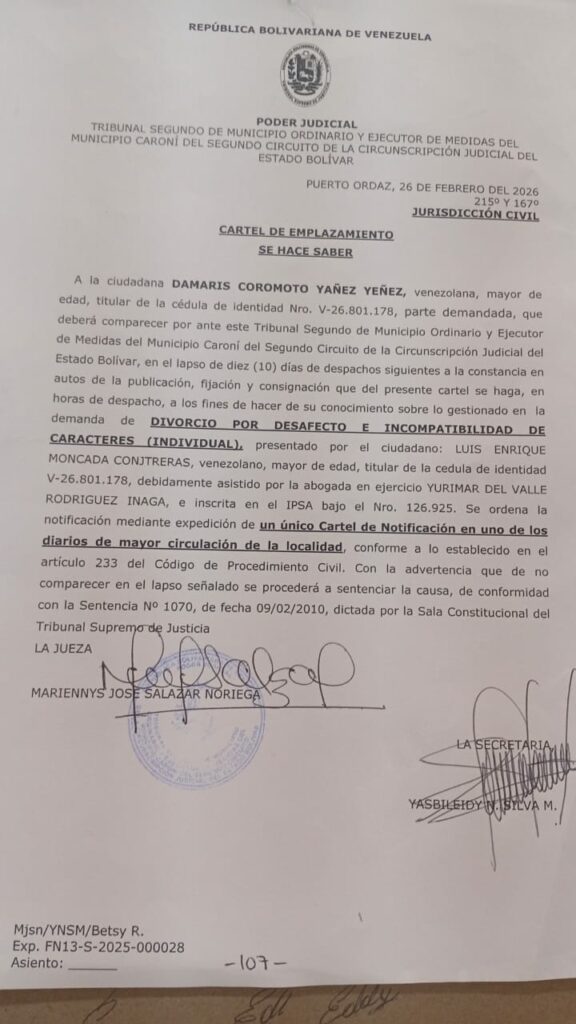 A la ciudadana DAMARIS COROMOTO YAÑEZ YEÑEZ, venezolana, mayor de edad, titular de la cédula de identidad Nro. V-26.801.178, parte demandada, que deberá comparecer por ante este Tribunal Segundo de Municipio Ordinario y Ejecutor de Medidas del Municipio Caroní del Segundo Circuito de la Circunscripción Judicial del Estado Bolívar, en el lapso de diez (10) días de despachos siguientes a la constancia en autos de la publicación, fijación y consignación que del presente cartel se haga, en horas de despacho, a los fines de hacer de su conocimiento sobre lo gestionado en la demanda de DIVORCIO POR DESAFECTO E INCOMPATIBILIDAD DE CARACTERES (INDIVIDUAL), presentado por el ciudadano: LUIS ENRIQUE MONCADA CONJTRERAS, venezolano, mayor de edad, titular de la cédula de identidad V-26.801.178, debidamente asistido por la abogada en ejercicio YURIMAR DEL VALLE RODRÍGUEZ INAGA, e inscrita en el IPSA bajo el Nro. 126.925. Se ordena la notificación mediante expedición de un único Cartel de Notificación en uno de los diarios de mayor circulación de la localidad, conforme a lo establecido en el artículo 233 del Código de Procedimiento Civil. Con la advertencia que de no comparecer en el lapso señalado se procederá a sentenciar la causa, de conformidad con la Sentencia Nº 1070, de fecha 09/02/2010, dictada por la Sala Constitucional del Tribunal Supremo de Justicia