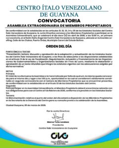 De conformidad con lo establecido en los artículos 31, 32, 33, 34 y 35 de los Estatutos Sociales del Centro Ítalo Venezolano de Guayana, la Junta Directiva convoca a los Miembros Propietarios a participar en la Asamblea Extraordinaria, que se celebrará el día doce (12) de abril de 2026, a las 12:00 m., en primera convocatoria, en el Salón Salto Ángel del Centro Ítalo Venezolano de Guayana, ubicado en la Avenida Loefling, Calle de los Clubes, Puerto Ordaz, Municipio Caroní del Estado Bolívar.