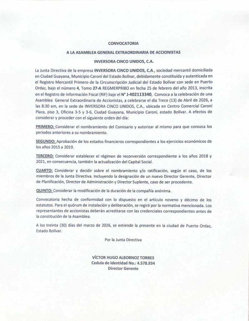 La Junta Directiva de la empresa INVERSORA CINCO UNIDOS, C.A., sociedad mercantil domiciliada en Ciudad Guayana, Municipio Caroní del Estado Bolívar, debidamente constituida y autenticada en el Registro Mercantil Primero de la Circunscripción Judicial del Estado Bolívar con sede en Puerto Ordaz, bajo el número 4, Tomo 27-A REGMERPRIBO en fecha 25 de febrero del año 2013, inscrita en el Registro de Información Fiscal (RIF) bajo el N° J-402113340, convoca a la celebración de una Asamblea General Extraordinaria de Accionistas, a celebrarse el día Trece (13) de Abril de 2026, a las 8:30 am, en la sede de INVERSORA CINCO UNIDOS, C.A., ubicada en Centro Comercial Caroní Plaza, piso 3, Oficina 3-5 y 3-6, Ciudad Guayana, Municipio Caroní, estado Bolívar. A efectos de considerar y proceder con el siguiente orden del día: