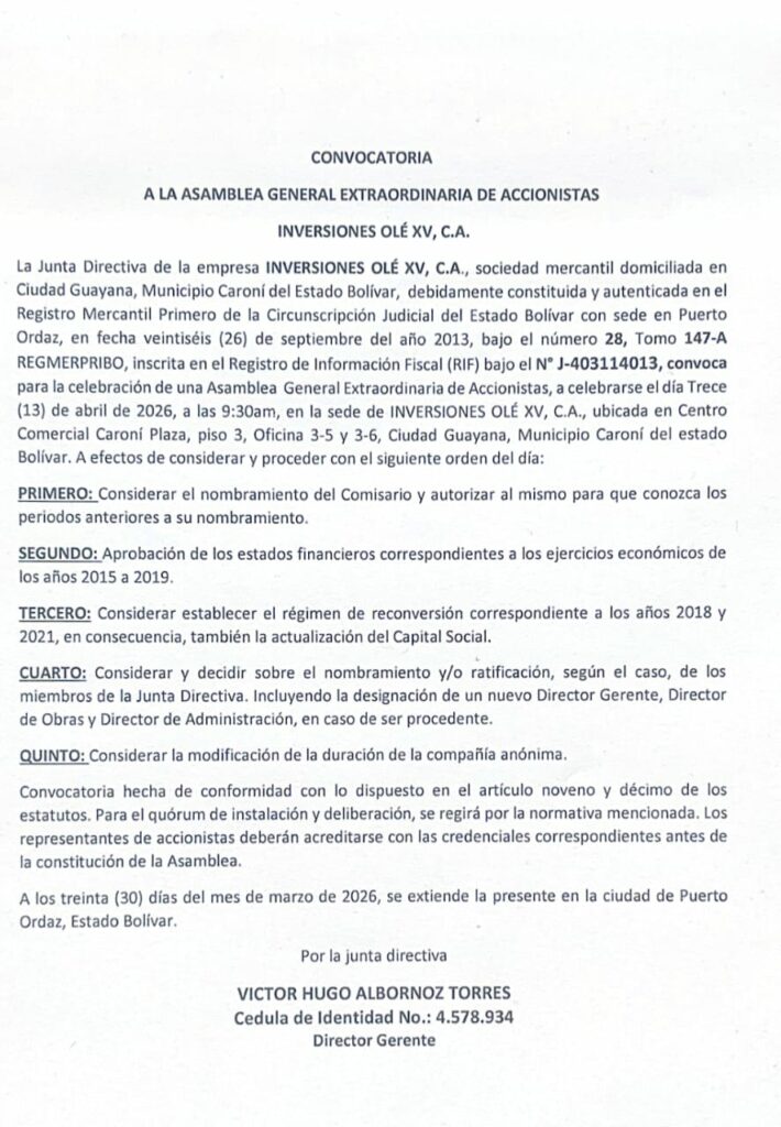 La Junta Directiva de la empresa INVERSIONES OLÉ XV, C.A., sociedad mercantil domiciliada en Ciudad Guayana, Municipio Caroní del Estado Bolívar, debidamente constituida y autenticada en el Registro Mercantil Primero de la Circunscripción Judicial del Estado Bolívar con sede en Puerto Ordaz, en fecha veintiséis (26) de septiembre del año 2013, bajo el número 28, Tomo 147-A REGMERPRIBO, inscrita en el Registro de Información Fiscal (RIF) bajo el N° J-403114013, convoca para la celebración de una Asamblea General Extraordinaria de Accionistas, a celebrarse el día Trece (13) de abril de 2026, a las 9:30am, en la sede de INVERSIONES OLÉ XV, C.A., ubicada en Centro Comercial Caroní Plaza, piso 3, Oficina 3-5 y 3-6, Ciudad Guayana, Municipio Caroní del estado Bolívar. A efectos de considerar y proceder con el siguiente orden del día: