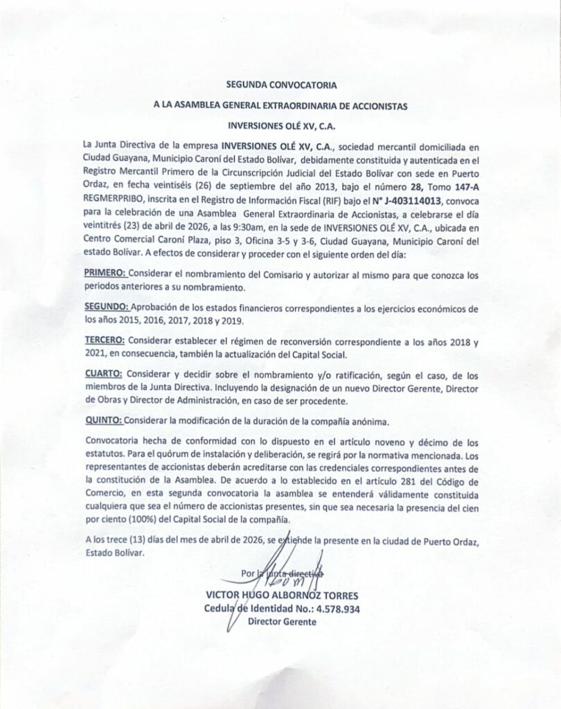 La Junta Directiva de la empresa INVERSIONES OLÉ XV, C.A., sociedad mercantil domiciliada en Ciudad Guayana, Municipio Caroní del Estado Bolívar, debidamente constituida y autenticada en el Registro Mercantil Primero de la Circunscripción Judicial del Estado Bolívar con sede en Puerto Ordaz, en fecha veintiséis (26) de septiembre del año 2013, bajo el número 28, Tomo 147-A REGMERPRIBO, inscrita en el Registro de Información Fiscal (RIF) bajo el N° J-403114013, convoca para la celebración de una Asamblea General Extraordinaria de Accionistas, a celebrarse el día veintitrés (23) de abril de 2026, a las 9:30am, en la sede de INVERSIONES OLÉ XV, C.A., ubicada en Centro Comercial Caroní Plaza, piso 3, Oficina 3-5 y 3-6, Ciudad Guayana, Municipio Caroní del estado Bolívar. A efectos de considerar y proceder con el siguiente orden del día: