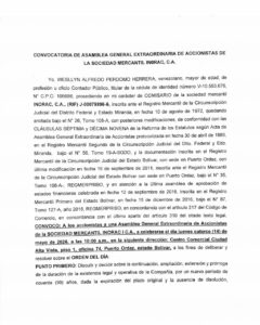 CONVOCATORIA DE ASAMBLEA GENERAL EXTRAORDINARIA DE ACCIONISTAS DE LA SOCIEDAD MERCANTIL INORAC, C.A.