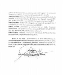 NOTA: Se hace saber a los accionistas que el informe del Comisario y los documentos a considerar estarán a disposición en la dirección arriba señalada con quince (15) días de anticipación a la celebración de la Asamblea, en atención a lo dispuesto en el articulo 306 del Código de Comercio. En Puerto Ordaz, a los veintiún (21) días del mes de abril de 2026.