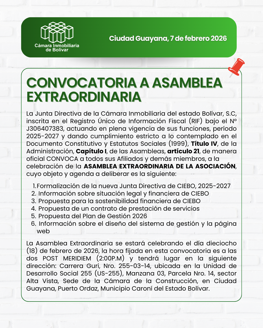 La Junta Directiva de la Cámara Inmobiliaria del estado Bolívar, S.C, inscrita en el Registro Único de Información Fiscal (RIF) bajo el N° J306407383, actuando en plena vigencia de sus funciones, período 2025-2027 y dando cumplimiento estricto a lo contemplado en el Documento Constitutivo y Estatutos Sociales (1999), Título IV, de la Administración, Capítulo I, de las Asambleas, artículo 21, de manera oficial CONVOCA a todos sus Afiliados y demás miembros, a la celebración de la ASAMBLEA EXTRAORDINARIA DE LA ASOCIACIÓN, cuyo objeto y agenda a deliberar es la siguiente: