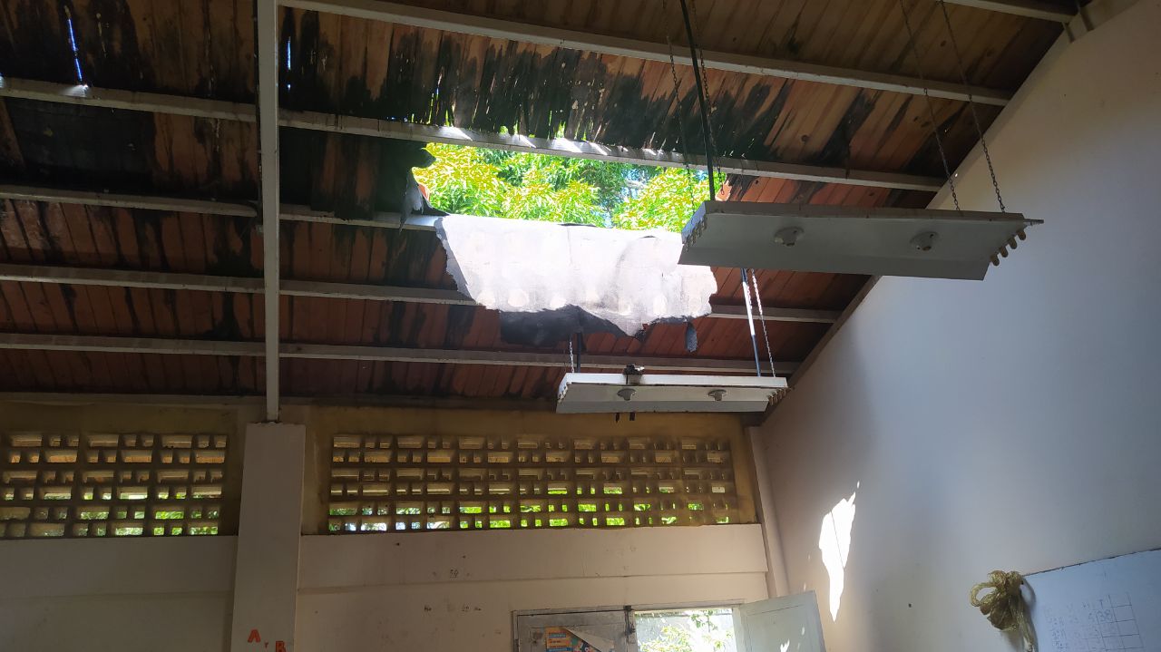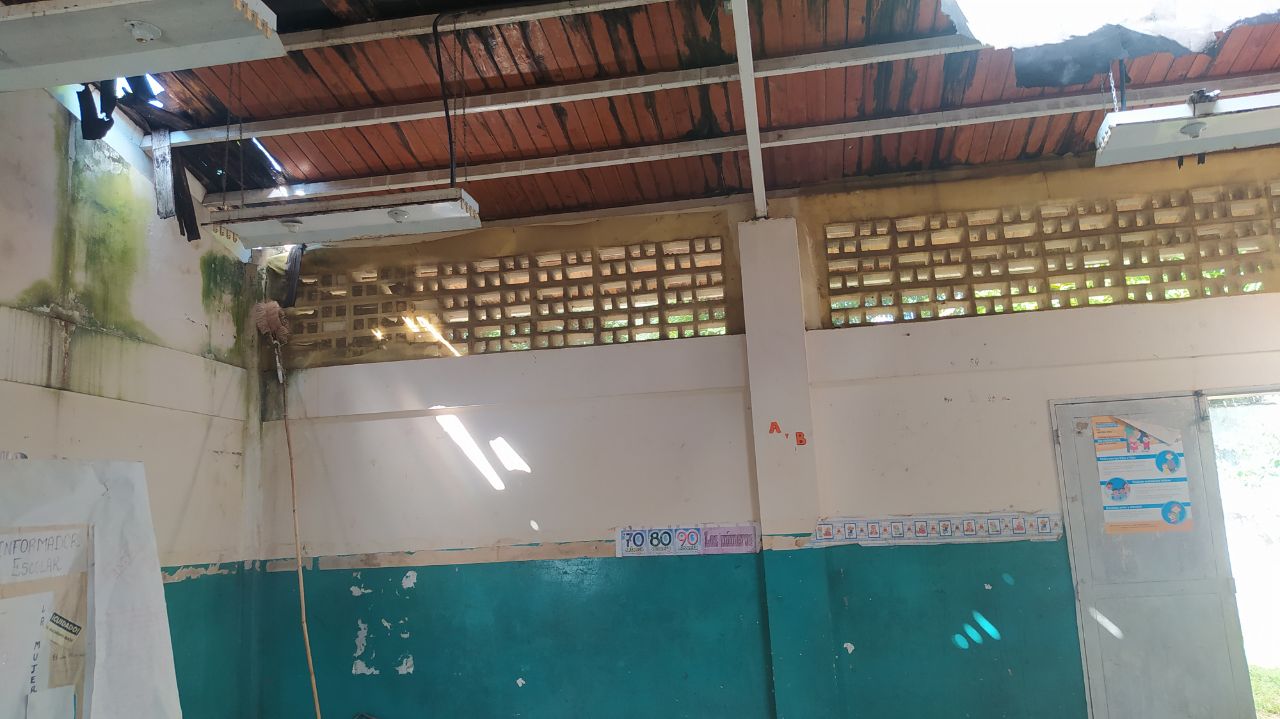 Desde hace más de cuatro años, uno de los salones permanece inhabilitado por el deterioro del techo que permite el paso del agua de las lluvias. Situaciones similares se repiten en las nueve aulas de la institución, cuyas paredes también tienen filtraciones.