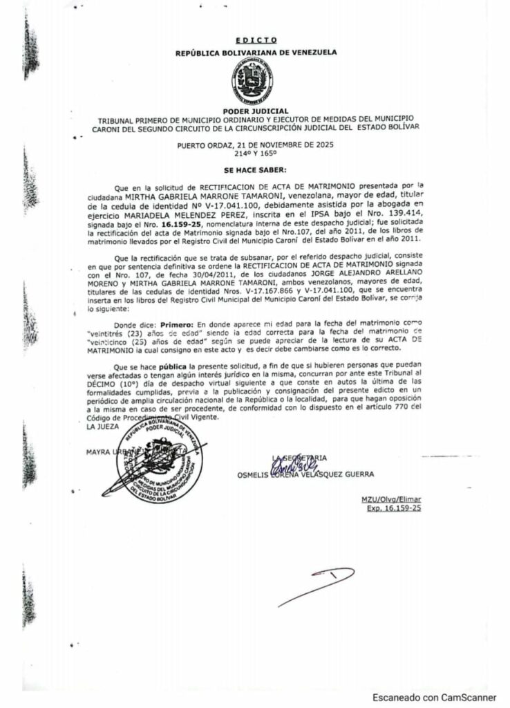 Que la rectificación que se trata de subsanar, por el referido despacho judicial, consiste en que por sentencia definitiva se ordene la RECTIFICACION DE ACTA DE MATRIMONIO signada con el Nro. 107, de fecha 30/04/2011, de los ciudadanos JORGE ALEJANDRO ARELLANO MORENO y MIRTHA GABRIELA MARRONE TAMARONI, ambos venezolanos, mayores de edad, titulares de las cedulas de identidad Nros. V-17.167.866 y V-17.041.100, que se encuentra inserta en los libros del Registro Civil Municipal del Municipio Caroní del Estado Bolívar, se corrija lo siguiente: