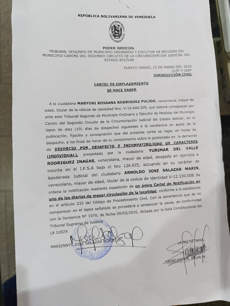 A la ciudadana MARYORI ROSSANA RODRIGUEZ PULIDO, venezolana, mayor de edad, titular de la cédula de identidad Nro. V-14.644.509, que deberá comparecer por ante este Tribunal Segundo de Municipio Ordinario y Ejecutor de Medidas del Municipio Caroní del Segundo Circuito de la Circunscripción Judicial del Estado Bolívar, en el lapso de diez (10) días de despachos siguientes a la constancia en autos de la publicación, fijación y consignación que del presente cartel se haga, en horas de despacho, a los fines de hacer de su conocimiento sobre lo gestionado en la demanda de DIVORCIO POR DESAFECTO E INCOMPATIBILIDAD DE CARACTERES (INDIVIDUAL), presentado por la ciudadana: YURIMAR DEL VALLE RODRIGUEZ INAGAS, venezolana, mayor de edad, abogada en ejercicio e inscrita en el I.P.S.A bajo el Nro 126.925, actuando en su carácter de Apoderada Judicial del ciudadano ARNOLDO JOSE SALAZAR MARIN, venezolano, mayor de edad, titular de la cedula de identidad V-12.130.008.