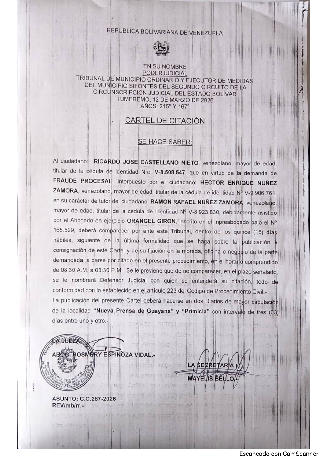 Al ciudadano RICARDO JOSE CASTELLANO NIETO, venezolano, mayor de edad, titular de la cédula de identidad Nro. V-8.508.547, que en virtud de la demanda de FRAUDE PROCESAL, interpuesto por el ciudadano: HECTOR ENRIQUE NUÑEZ ZAMORA, venezolano mayor de edad, titular de la cédula de identidad Nº V-9.906.761. en su carácter de tutor del ciudadano, RAMON RAFAEL NUÑEZ ZAMORA, venezolana mayor de edad, titular de la cédula de Identidad N° V-8.923 830.