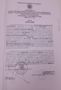 Que con motivo de la demanda por: ACCIÓN MERO DECLARATIVA DE CONCUBINATO, tramitada en el Exp. FP11-V-2026-000127, de la nomenclatura interna de este despacho judicial, interpuesta por la ciudadana: MAGALI JOSEFINA CARPINTERO, venezolana, mayor de edad, titular de la Cédula de Identidad Nro. V-9.277.571, debidamente asistida por el abogado en ejercicio LUIS OROZCO, venezolano, mayor de edad, inscrito en el IPSA bajo el Nro. 172.265, interpuesta en contra de la ciudadana EUMELIA BAUTISTA VELÁSQUEZ VELIZ, venezolana, mayor de edad, titular de la Cédula de Identidad Nro. V-8.400.534, en su condición de hermana biológica del ciudadano (DE CUJUS): OSWALDO LUIS VELÁSQUEZ VELIZ quien era venezolano, mayor de edad y titular de la Cédula de Identidad Nro. V-9.975.997, en la cual solicita que se le declare de derecho la ACCIÓN MERO DECLARATIVA DE CONCUBINATO que existió entre ella y el ciudadano (DE CUJUS): OSWALDO LUIS VELASQUEZ VELIZ. Ut supra identificados, la cual inicio desde el 14 de febrero del año 1985, hasta el día de su fallecimiento de fecha 27 de diciembre del 2025.