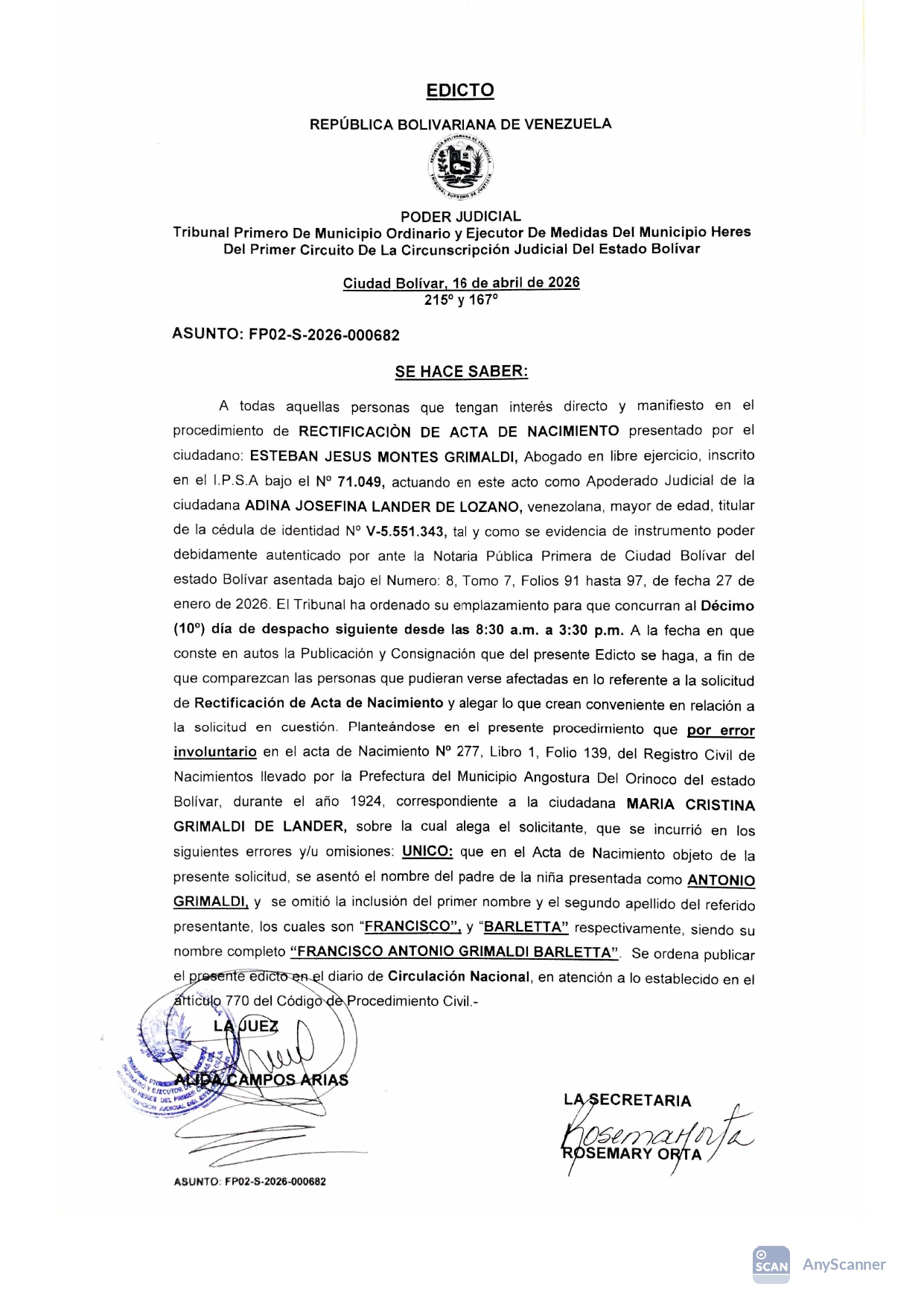 El Tribunal ha ordenado su emplazamiento para que concurran al Décimo (10°) dia de despacho siguiente desde las 8:30 a.m. a 3:30 p.m. A la fecha en que conste en autos la Publicación y Consignación que del presente Edicto se haga, a fin de que comparezcan las personas que pudieran verse afectadas en lo referente a la solicitud de Rectificación de Acta de Nacimiento y alegar lo que crean conveniente en relación a la solicitud en cuestión Planteándose en el presente procedimiento que por error involuntario en el acta de Nacimiento Nº 277, Libro 1. Folio 139, del Registro Civil de Nacimientos llevado por la Prefectura del Municipio Angostura Del Orinoco del estado Bolivar, durante el año 1924, correspondiente a la ciudadana MARIA CRISTINA GRIMALDI DE LANDER, sobre la cual alega el solicitante, que se incurrió en los siguientes errores y/u omisiones. UNICO: que en el Acta de Nacimiento objeto de la presente solicitud, se asentó el nombre del padre de la niña presentada como ANTONIO GRIMALDI, y se omitió la inclusión del primer nombre y el segundo apellido del referido presentante, los cuales son ‘FRANCISCO”, y “BARLETTA” respectivamente, siendo su nombre completo “FRANCISCO ANTONIO GRIMALDI BARLETTA”.