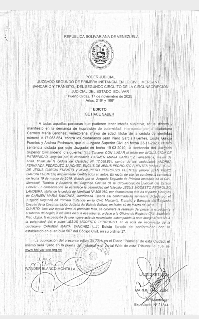 A todas aquellas personas que pudieren tener interés subjetivo, actual directo y manifiesto en la demanda de inquisición de paternidad, interpuesta por la ciudadana Carmen María Sánchez, venezolana, mayor de edad, titular de la cédula de identidad número V-17.068.864, contra los ciudadanos Jean Piero García Fuentes, Euglis Garcia Fuentes y Andrea Pedrouzo que el Juzgado Superior Civil en fecha 23-11-2023, ratificó sentencia dictada por este Juzgado en fecha 19-03-2019, la sentencia del Juzgado Superior Civil ordenó lo siguiente: “(…) Tercero: CON LUGAR el juicio por INQUISICIÓN DE PATERNIDAD, seguido pro la ciudadana CARMEN MARIA SANCHEZ, venezolana, mayor de edad, titular de la cédula de identidad N° 17.068.864, contra de los ciudadanos ANDREA FERNANDA PEDROUZO SANCHEZ, EUGLIS DE JESUS PEDROUZO FUENTES (ahora EUGLIS DE JESUS GARCIA FUENTE) Y JEAN PIERO PEDROUZO FUENTES (ahora JEAN PIERO GARCIA FUENTES) ampliamente identificados en autos. En razón de ello, se confirma la sentencia de fecha 19 de marzo de 2019, dictada por el Juzgado Segundo de Primera instancia en lo Civil, Mercantil, Tránsito y Bancario del Segundo Circuito de la Circunscripción Judicial del Estado Bolívar. En consecuencia se establece la paternidad del fallecido JESUS MODESTO PEDROUZO LANDEIRA, titular de la cedula de identidad N° 508.080, por demostrarse que es el padre biológico de CARMEN MARIA SANCHEZ, identificada. Queda así confirmada la sentencia dictada por el Juzgado Segundo de Primera Instancia en lo Civil, Mercantil, Transito y Bancario del Segundo Circuito de la Circunscripción Judicial del Estado Bolivar, en fecha 19 de marzo de 2019.