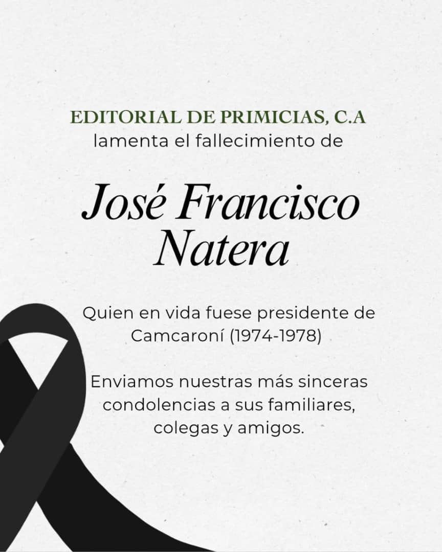 EDITORIAL DE PRIMICIAS, C.A. lamenta el fallecimiento de José Francisco Natera.