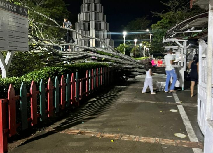 El árbol quedó tendido en la caminería del parque, afectando el paso de visitantes y a los negocios de comida rápida y juguetería que hay en la zona.
