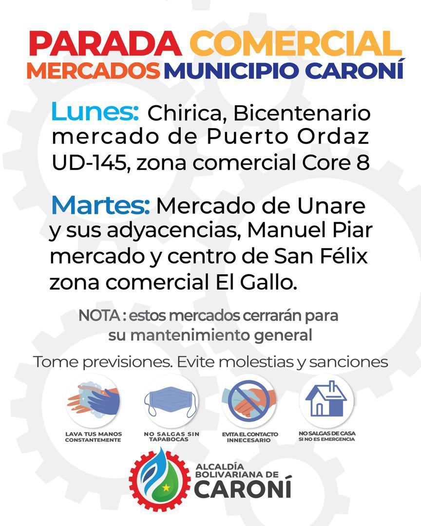 Según el cronograma, detallaron que el lunes corresponde a los mercados Chirica, Bicentenario, Puerto Ordaz, UD-145 y zonas Comercial Core 8.
