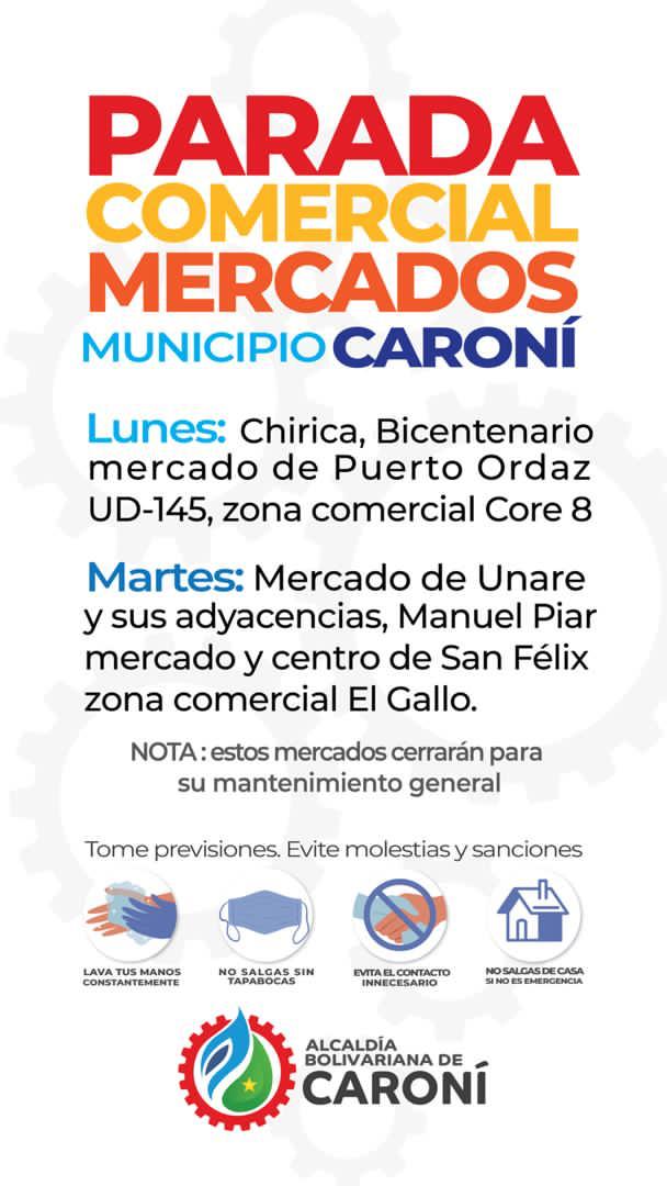 A pesar de la flexibilización total en el país, las paradas comerciales en los mercados de Caroní continuarán en diciembre, debido al mantenimiento general, bajo el cronograma establecido por las autoridades municipales.