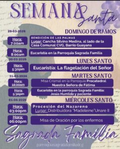 Vale destacar que la parroquia San Francisco de Asís ofrecerá un viacrucis viviente en la cancha del sector CVG. Será el Viernes Santo a las 3:00 p.m. También tendrán una misa solemne a las 9:00 a.m para celebrar el Domingo de Resurrección.