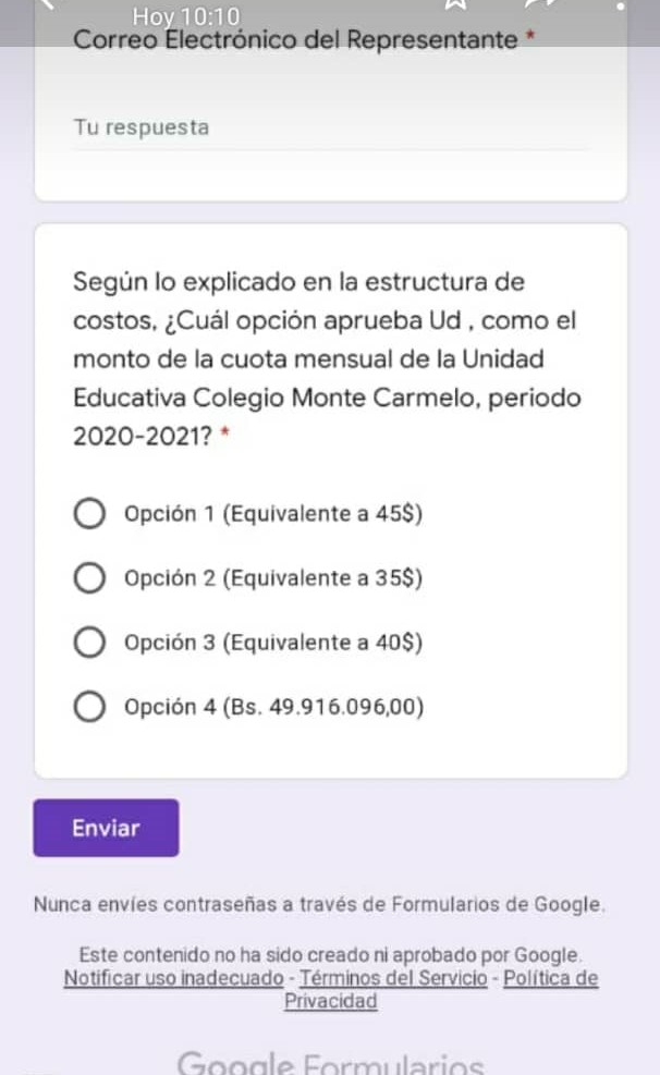 Comentaron que la directiva del plantel publicó la consulta para aprobarla este martes; sin embargo, las opciones a escoger son de 45$, 35$, 40$ y la última de 49.916.096 bolívares mensuales.